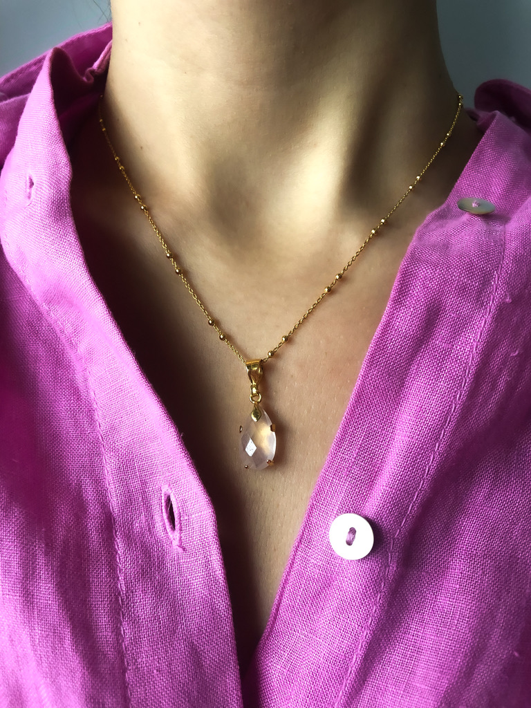 Łańcuszek z kuleczkami z naturalnym, szlifowanym kwarcem różowym w oprawie.